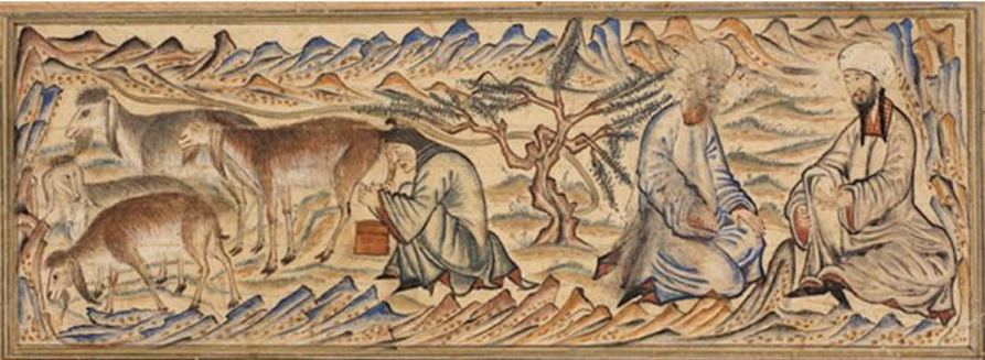 Mohammed (on the far right) and Abu Bakr on their way to Medina while a woman milks a herd of goats. Miniature illustration on vellum from the book Jami' al-Tawarikh (literally "Compendium of Chronicles" but often referred to as The Universal History or History of the World), by Rashid al-Din, published in Tabriz, Persia, 1307 A.D. Now in the collection of the Edinburgh University Library, Scotland.